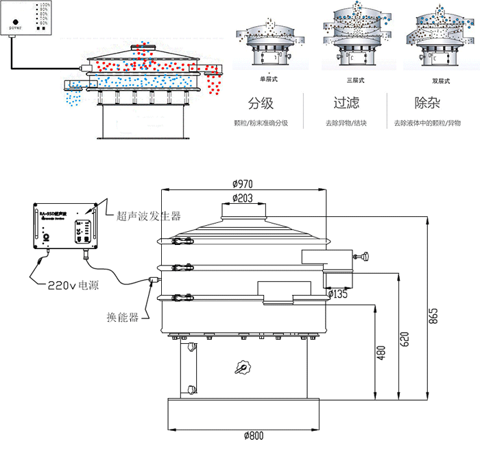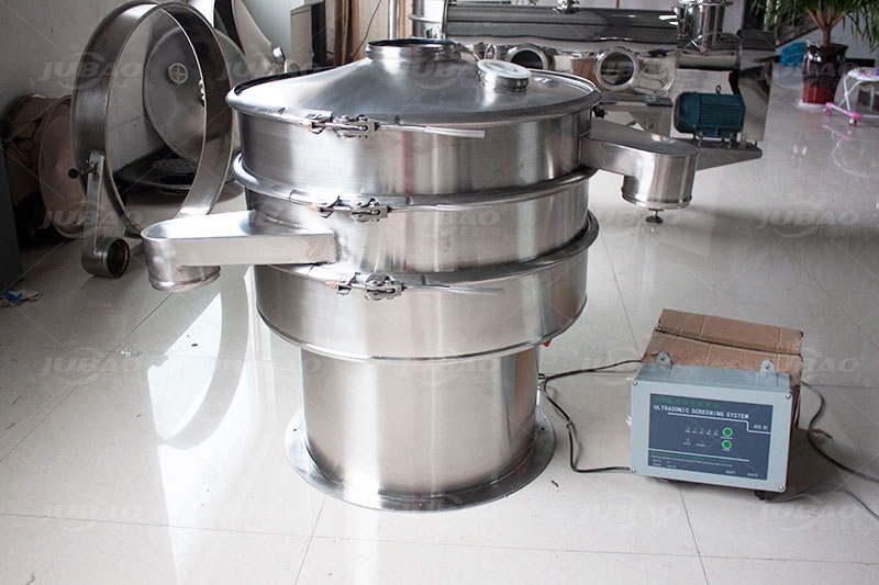 篩網上的物料在作低頻旋振運動的同時,疊加上超聲振動,既可防止網孔堵塞,又可使篩分機提高產量和質量,從而達到快速篩分和清網的目的,使超微細粉篩分成為易事,特別適合高附加值精細分體的用戶使用。