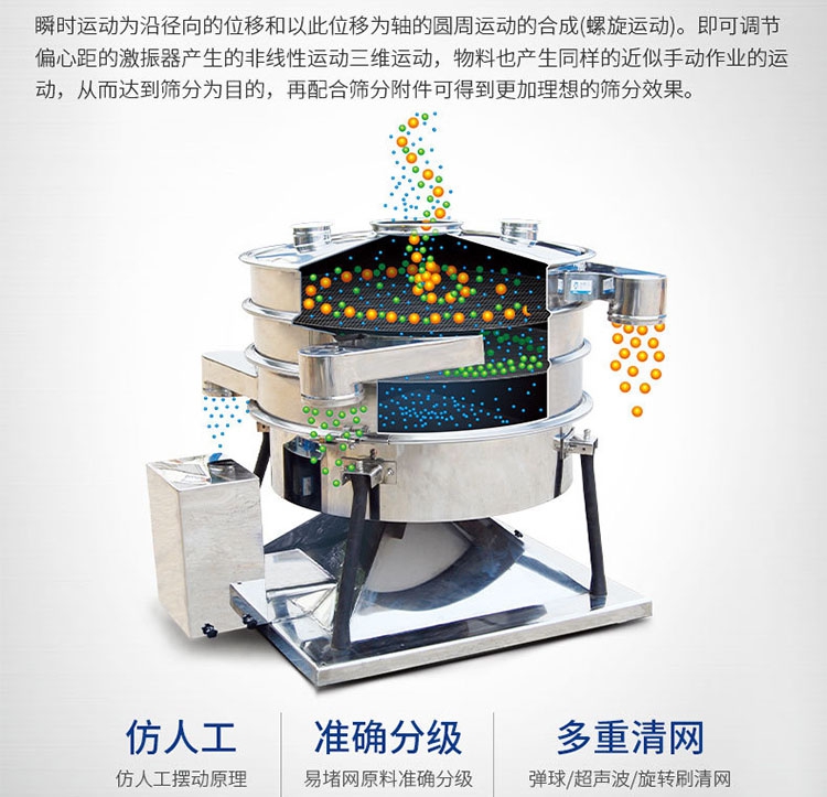 1、回旋式篩分:兩層同樣孔徑的篩網,讓篩過一次的物料再次篩分,以達到更高的篩分精度。