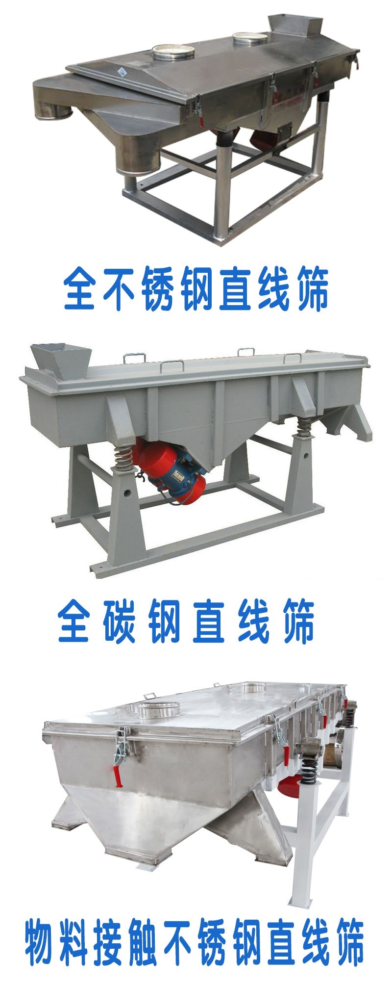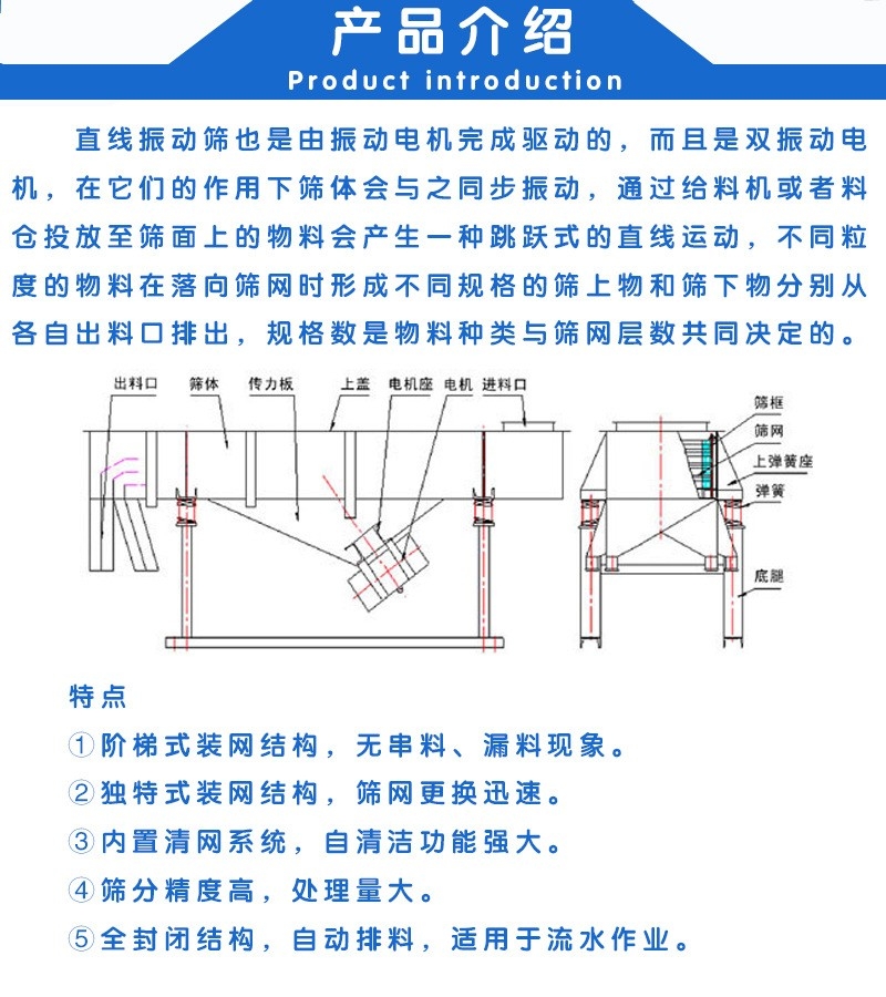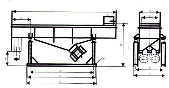 直線振動篩由篩箱、振動電機、減振系統及底架等組成。篩箱由槽體、上蓋、進料口、篩框、篩板(網)、襯網、出料口等組成。減振系統由阻尼彈簧和彈簧座等組成。