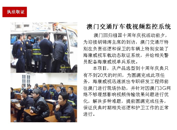 隨著無線傳輸技術和視頻監控技術的快速發展,我公司經過長期對行業的需求調研和應用探索,完全自主研發了針對公安、交警、運管、路政等部門的移動視頻監控取證系統(移動圖傳),成為治安監控和治安管理的有力補充。建設移動視頻監控取證系統,能將警力快速調動到一線,實時記錄執法過程,實時指揮執法過程,獲得完整有效的證據,快速達到執法目的,規范化整個執法過程,真正意義上實現城市治安點面結合的實戰應用需求,真正意義上與用戶業務需求緊密結合,滿足用戶實戰需要。