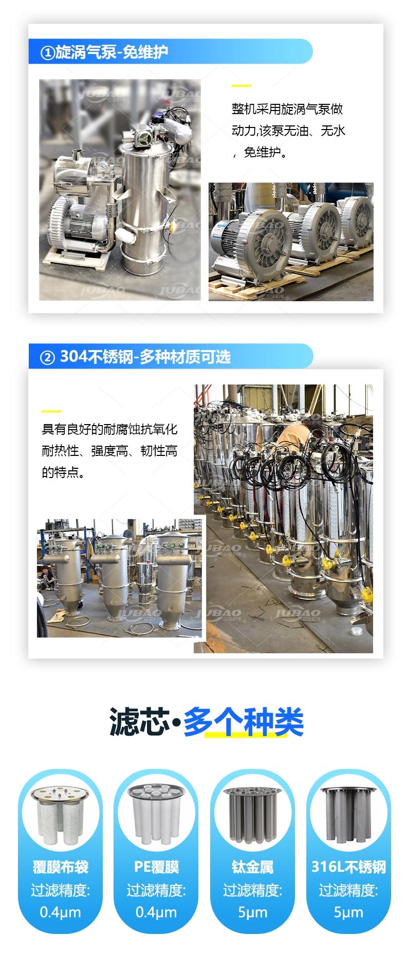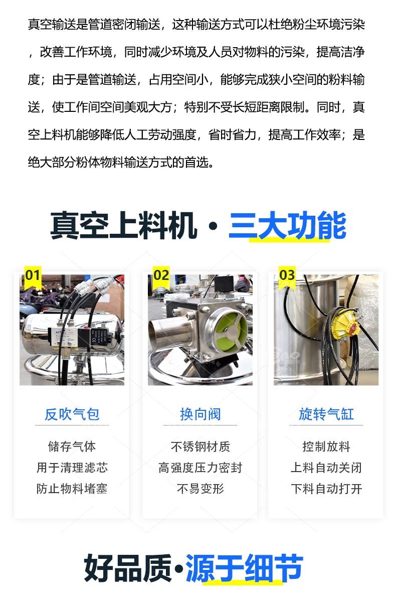 ZKS 真空上料機中裝有壓縮空氣反吹裝置,每次放料時,壓縮空氣脈沖反吹過濾器,把吸附于過濾器表面的粉末打落下來,使吸料能正常運行。
